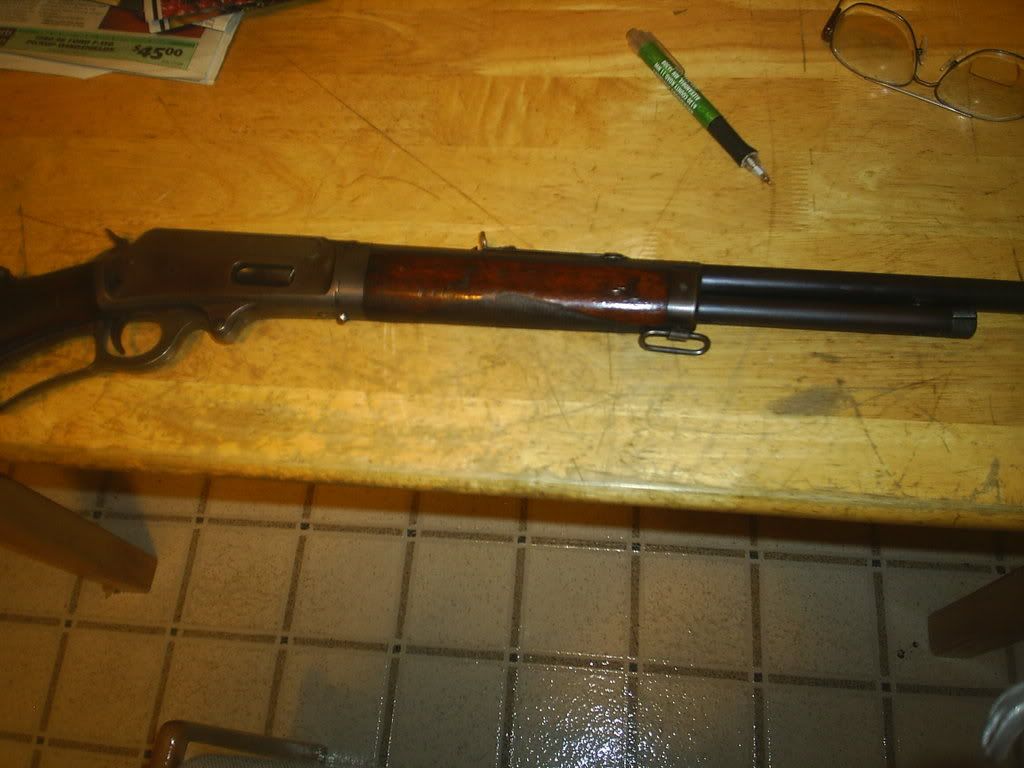 Hi Levergunners- This 44-40 has an 18" barrel, forearm with nosepiece, and full length magazine tube. It is serial # 3042**. On the Marlin Collectors site I've seen "baby carbines" with either barrel bands or MM93 had one (takedown model) with a forearm nosepiece. I'm wondering if my rifle is in an "original" configuration or if someone has shortened the barrel. They have clearly sanded and revarnished the wood.